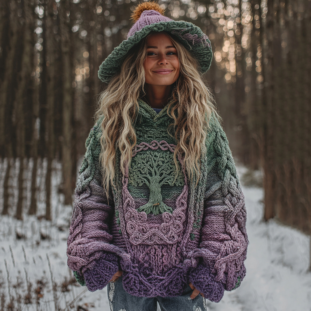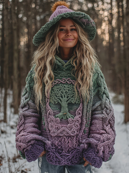 Women's Viking Celtic Knot Tree Of Life And Rose Knitted Jacquard Warm Hooded Sweater