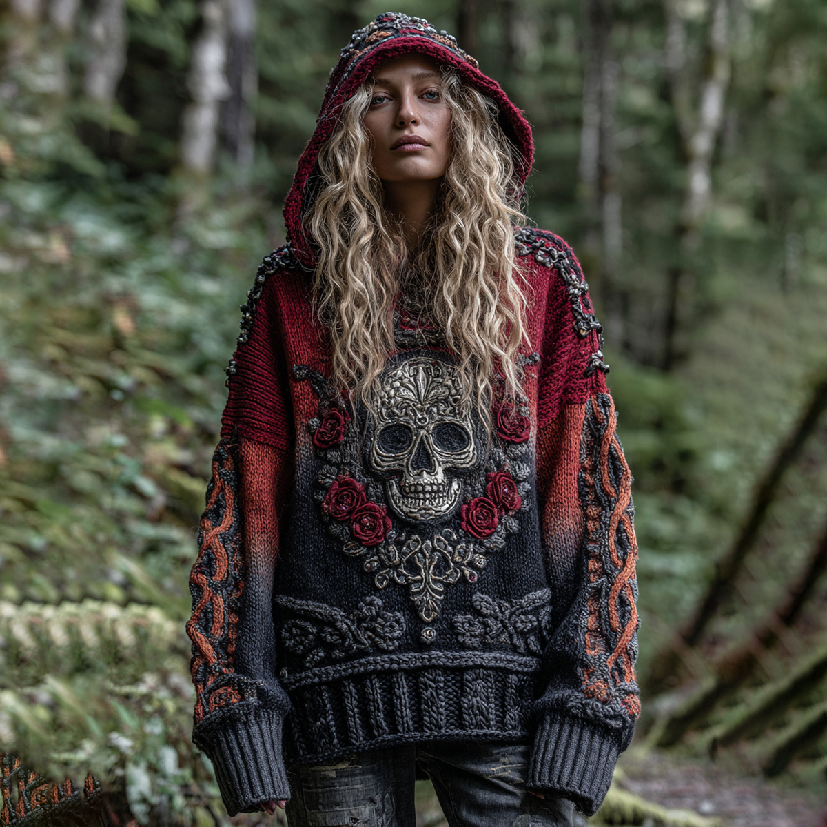 Women's Viking Tribal Jacquard Celtic With Red Rose And Skull Inspired Chunky Knit Hooded Sweater