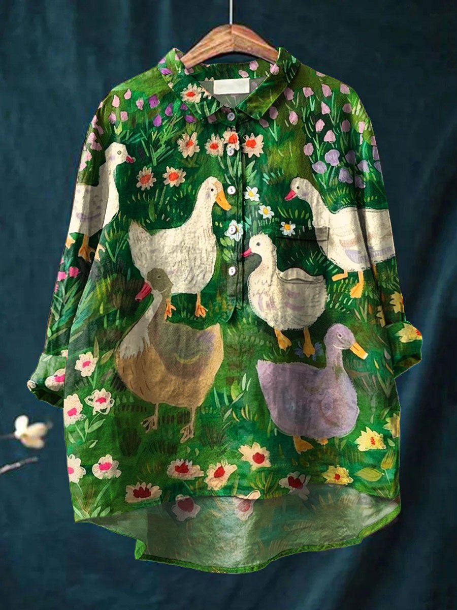Women's Vintage Abstract Mother Duck Art Print Casual Cotton And Linen Shirt