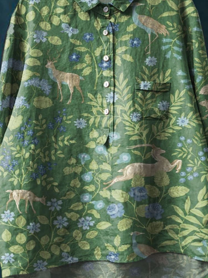 Women's Vintage Floral Animals Art Print Casual Cotton And Linen Shirt