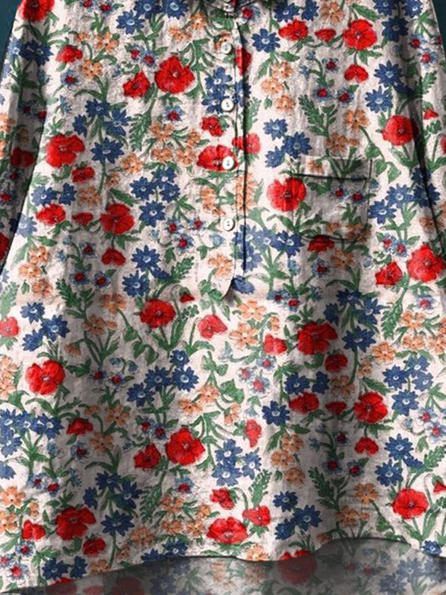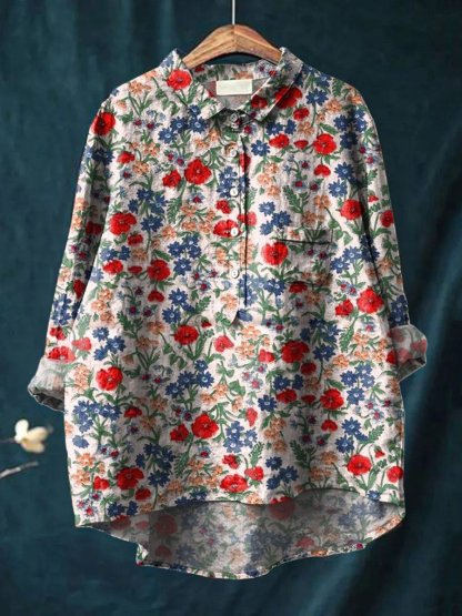 Women's Vintage Floral Art Print Casual Cotton And Linen Shirt