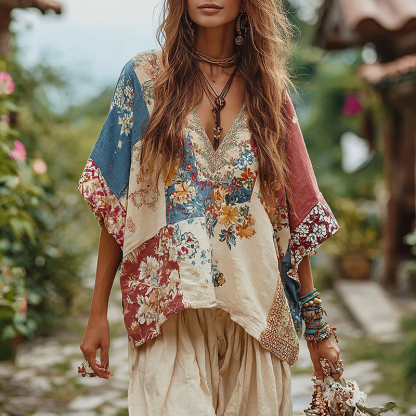 Women's Vintage Floral Patch V-neck T-shirt