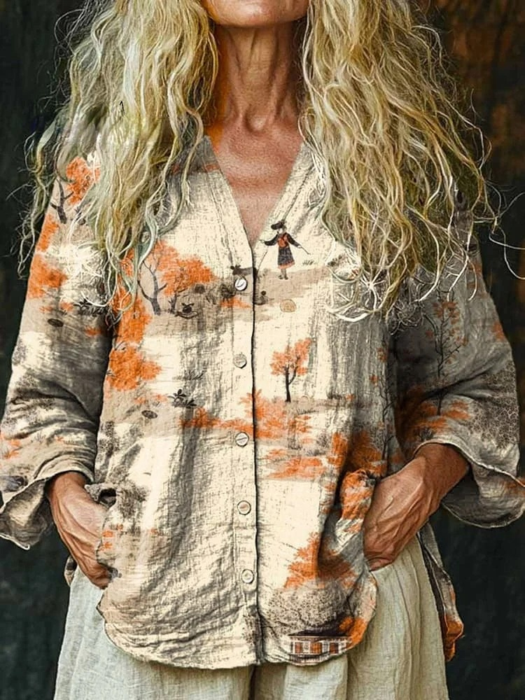 Women's Vintage Lovely Floral Art Print Linen And Cotton V-neck Casual Shirt