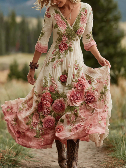 Women's Vintage Rose Floral Art V Neck Linen Blend Comfy Maxi Dress